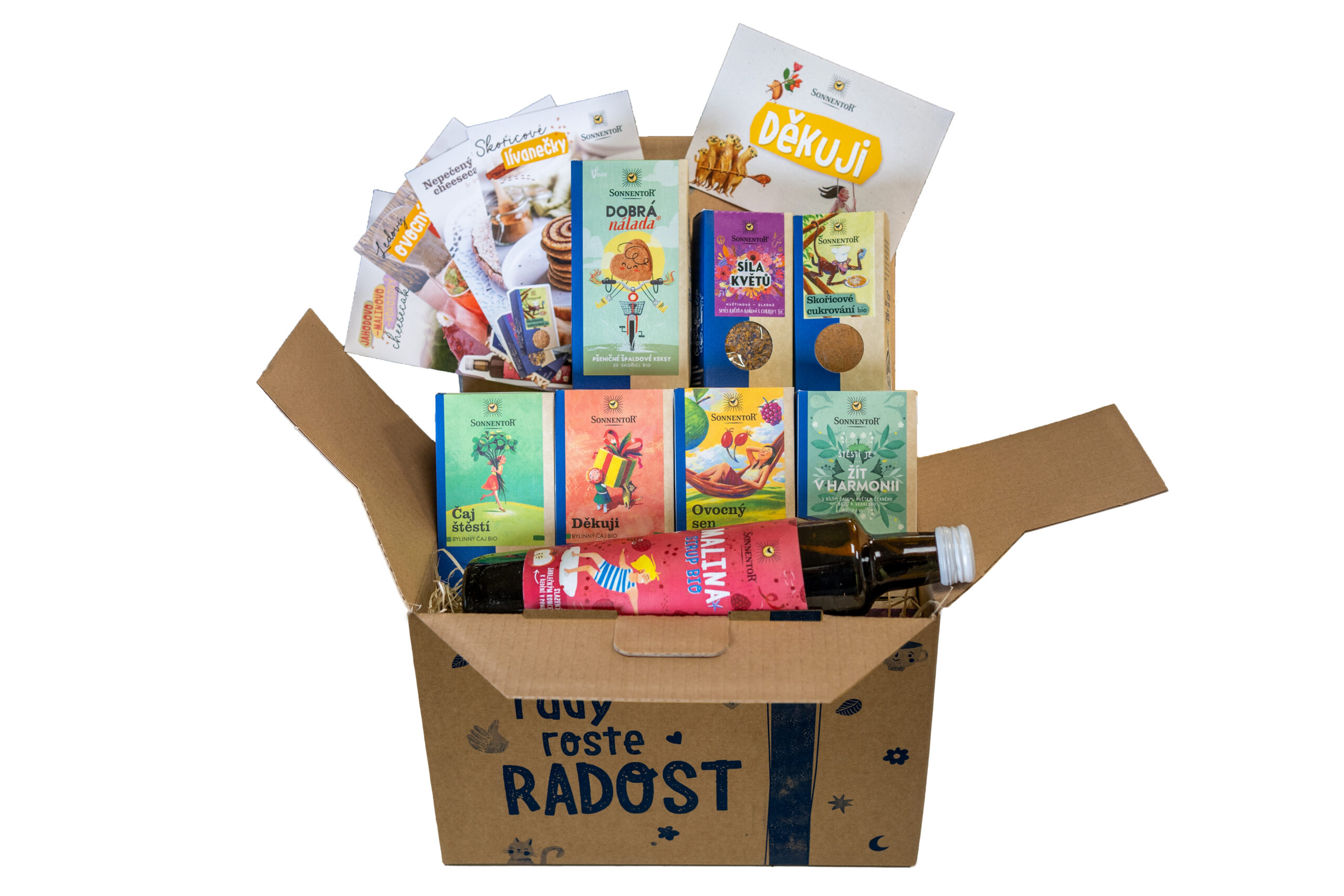Box obsahuje: bylinný Čaj štěstí, špaldové keksy Dobrá nálada, kořenící směs Síla květů, bylinný čaj Děkuji, ovocný čaj Ovocný sen, bylinný čaj Žít v harmonii, sirup bez přidaného cukru Malina, kořenící přípravek s cukrem Skořicové cukrování, 3x vzoreček libovolných čajů, 4x receptovou kartičku, 1x pohlednici